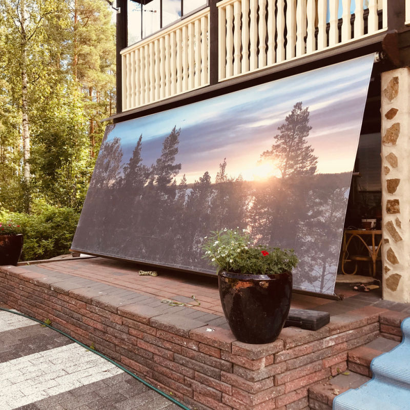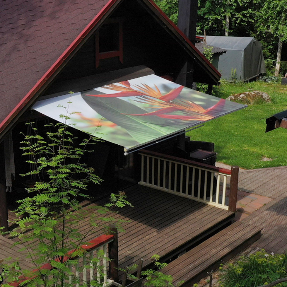 Toimitamme markiisi kankaat määrämittaan tehtynä joko haluamallasi kuvalla tai valmiilla värikuosilla.