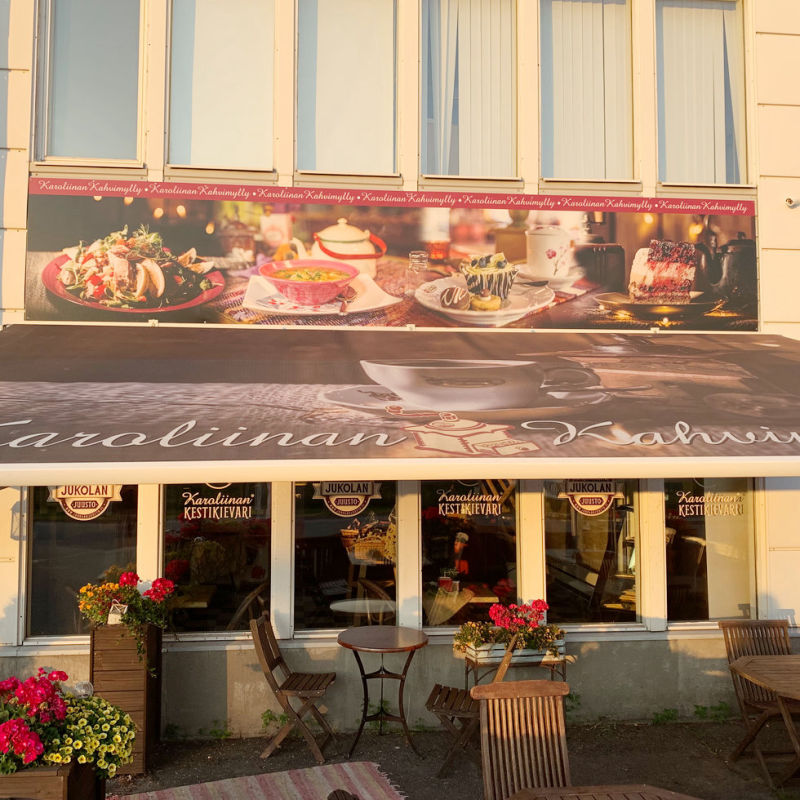 Leivonmäellä Karoliinan Kahvimyllyn julkisivu sai uuden ilmeen. Suunnittelimme siihen upeat kakkukuvataulut sekä markiisikangaskuvan.